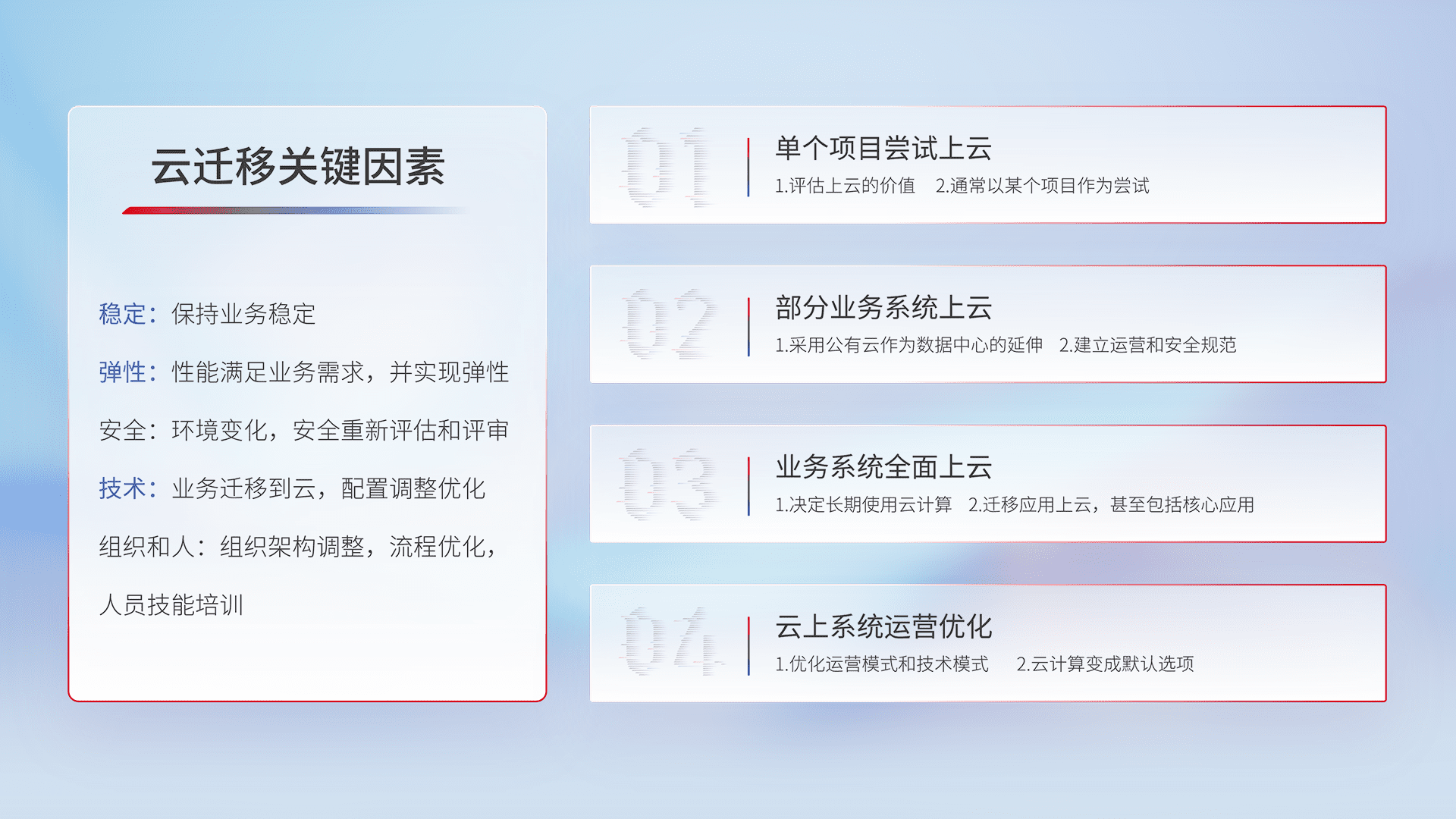 结合实际业务,,从规划设计、、、云平台选型、、、云原生改造、、数据迁移、、、集成交付,,,,迁移全过程为客户识别最佳上云路径,,,做好风险识别管理,,,,设计网络架构、、身份权限、、安全审计合规、、、操作审计、、、、日志审计、、、、监控告警策略、、多站点容灾设计等,,对云上基础设施进行整体规划,,,,提升IT治理水平,,以满足弹性、、、高可用、、、高性能的需求。。。